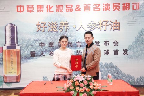 2017年12月6日,中草集化妆品总经理许明良与著名演员、著名主持人胡可签约,胡可正式成为中草集化妆品形象代言人。胡可早期凭借其清新、靓丽、自然亲和的风格备受多档热门节目观众的喜爱,后又通过自己的努力逐步在影视、话剧、综艺等领域崭露头角,在近期多档热播的节目中担当重要角色。其坚韧而温婉的性格、聪慧而优雅的外表与中草集低调务实的品牌特性与成为中国人放心且喜爱的民族品牌的使命感极度契合。
