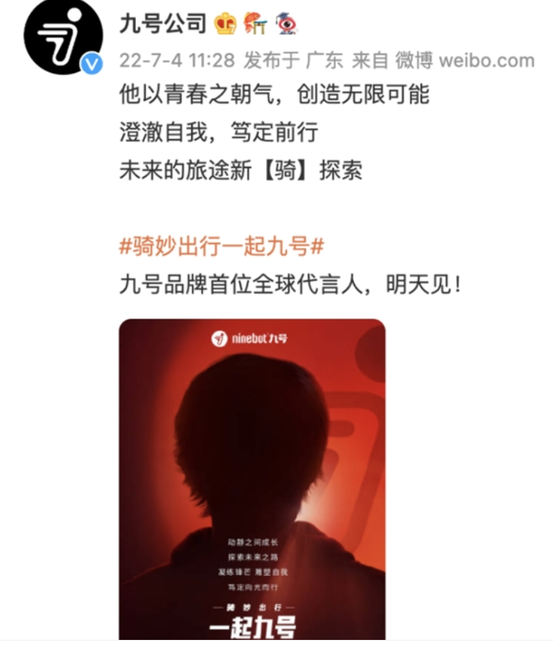 九号品牌首位全球代言人即将官宣 或为新生代演员易烊千玺