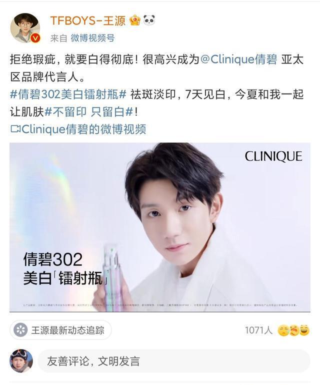 据悉,王源品牌代言人的身份还未官宣时,就有很多粉丝在倩碧线下专卖店看到了王源的海报。