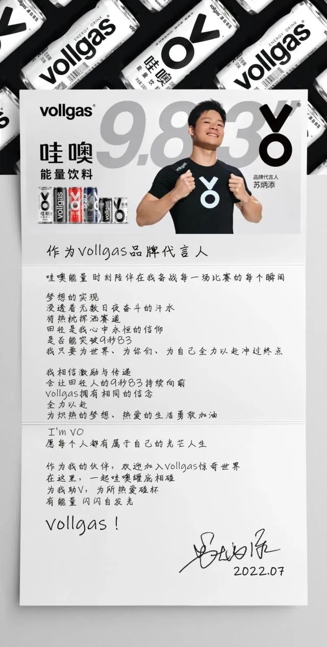 从首次代表中国出现在国际重量级的田径赛场上以来,苏炳添就从未停止过努力的步伐。通过科学的方法以及十年如一日的勤奋训练,突破亚洲人的生理极限,苏炳添最终在2021年的东京奥运会赛场上创造了亚洲100米田径新纪录。这样为热爱的事业全力以赴的精神,与vollgas的品牌价值观完美契合。
