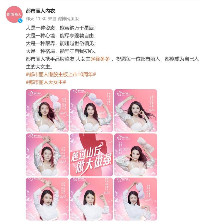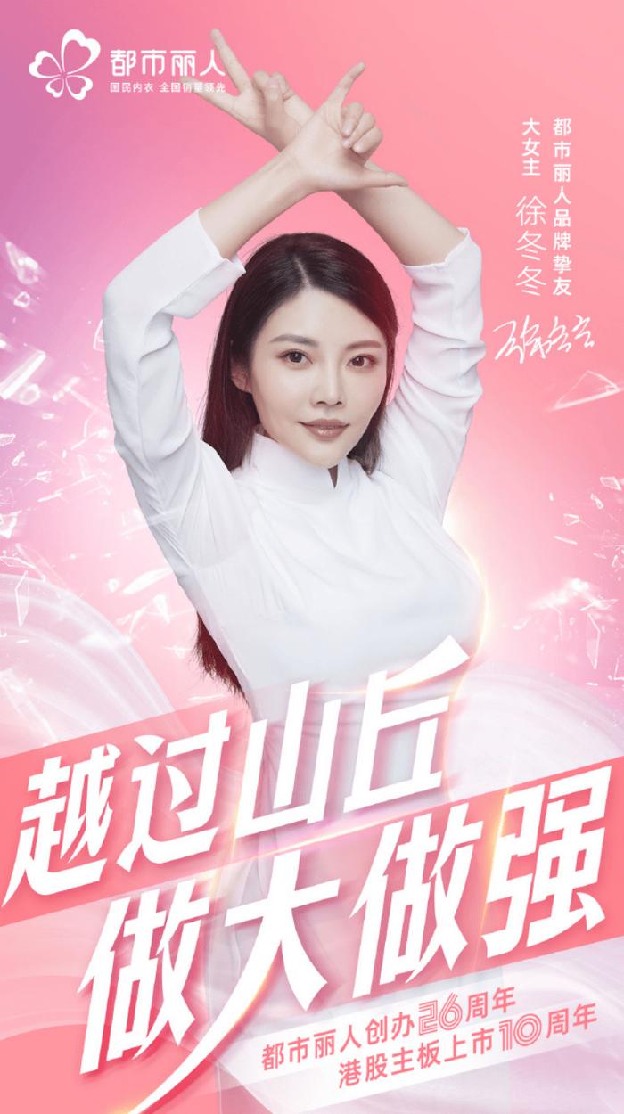 今年是都市丽人创办的第26周年,港股主板上市10周年,在这个特殊的时刻,都市丽人将欣赏和信赖的目光放在徐冬冬的身上,足可见得品牌对于徐冬冬的认可和喜爱。在品牌官宣当日,都市丽人发布了徐冬冬的“大女主”代言写真,写真中,徐冬冬以简约自信的形象展示着女性的自在与舒适,气场全开的她与品牌语言和气质契合度超高。