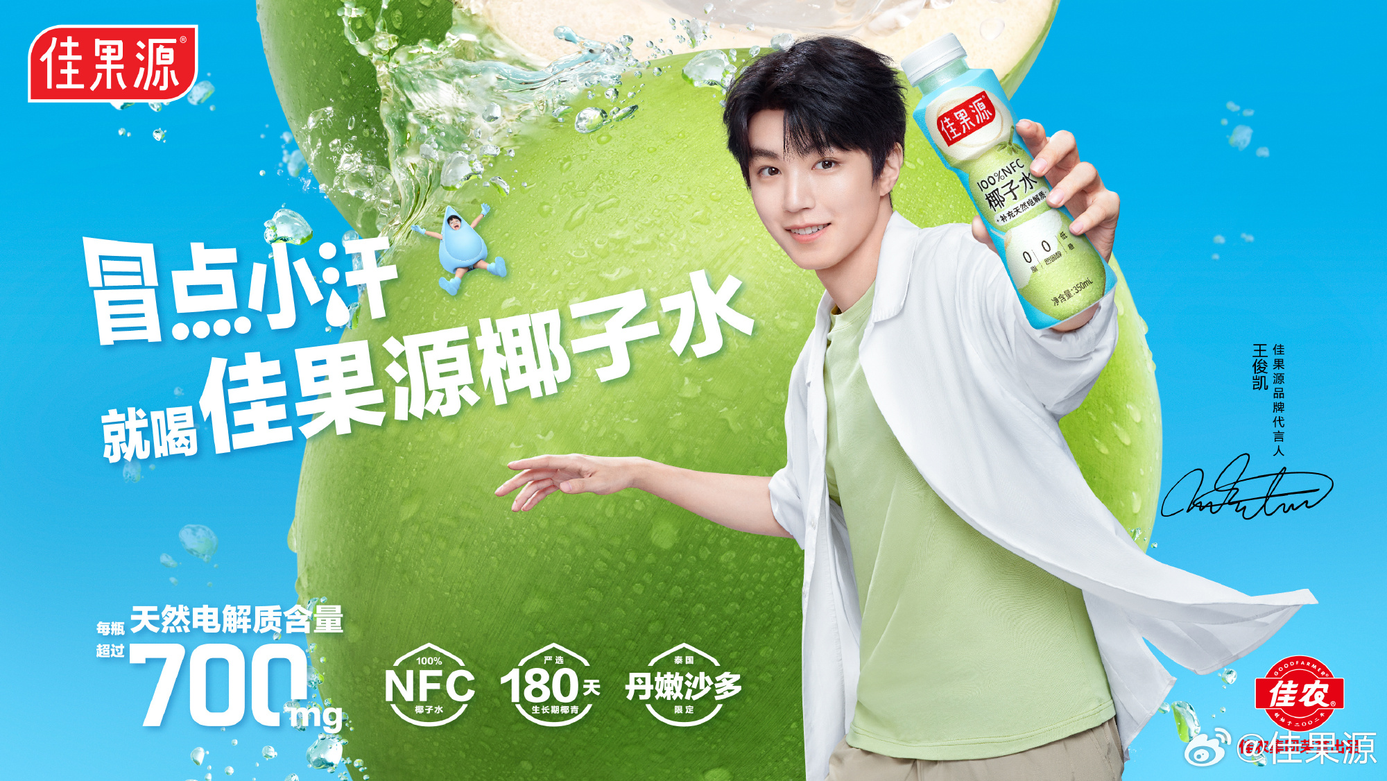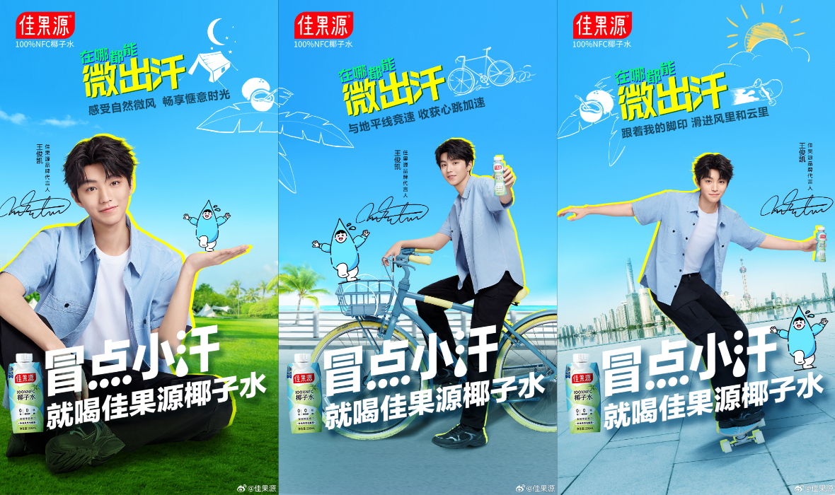 近日,佳果源官宣王俊凯(明星代言公司)成为品牌代言人,一同解锁夏天新鲜畅饮体验,将天然与活力分享给更多人。同期,佳果源推出 100% NFC 椰子水新品,为夏日出行补充天然电解质。