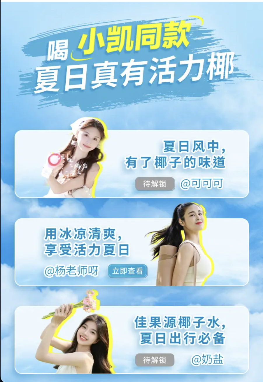 6 月 19 日至 6 月 21 日,佳果源联合小红书「星官宣计划」IP 打造「冒点小汗喝小凯同款」H5 互动话题页,邀请多位时尚生活博主分享佳果源椰子水饮用体验,鼓励用户参与搜索相关话题,分享椰风夏日瞬间,参与积分兑奖活动,调动夏日消费热情。