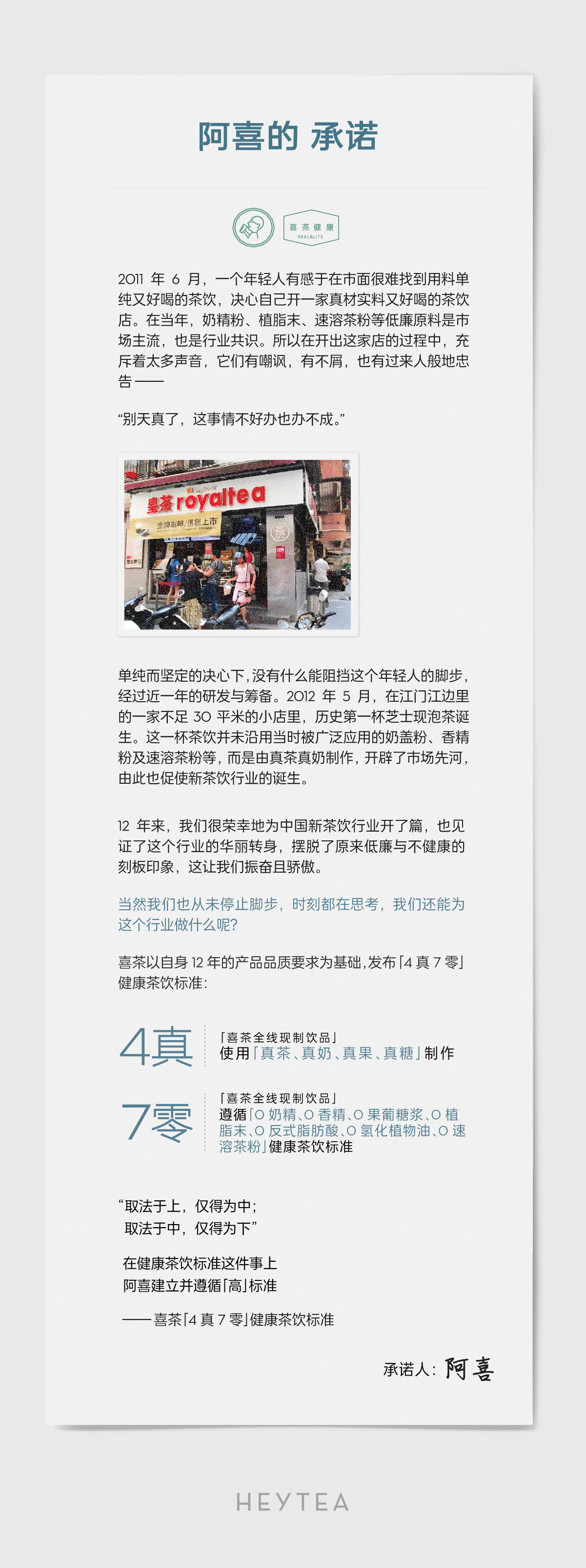 自 2012 乃年喜茶诞生以来,便始终坚持以真茶真奶之作。近日,喜茶决定以自身 12 年的产品品质要求为基础,发布「4 真 7 零」健康茶饮标准并邀请中国标准化协会作为技术指导单位,把这个承诺制定成了喜茶《新茶饮 现制茶饮》企业标准进行了公开公示。在未来,喜茶将继续走在不断追求健康的路上,拉高「底线」,给大家提供更多更健康的选择。
