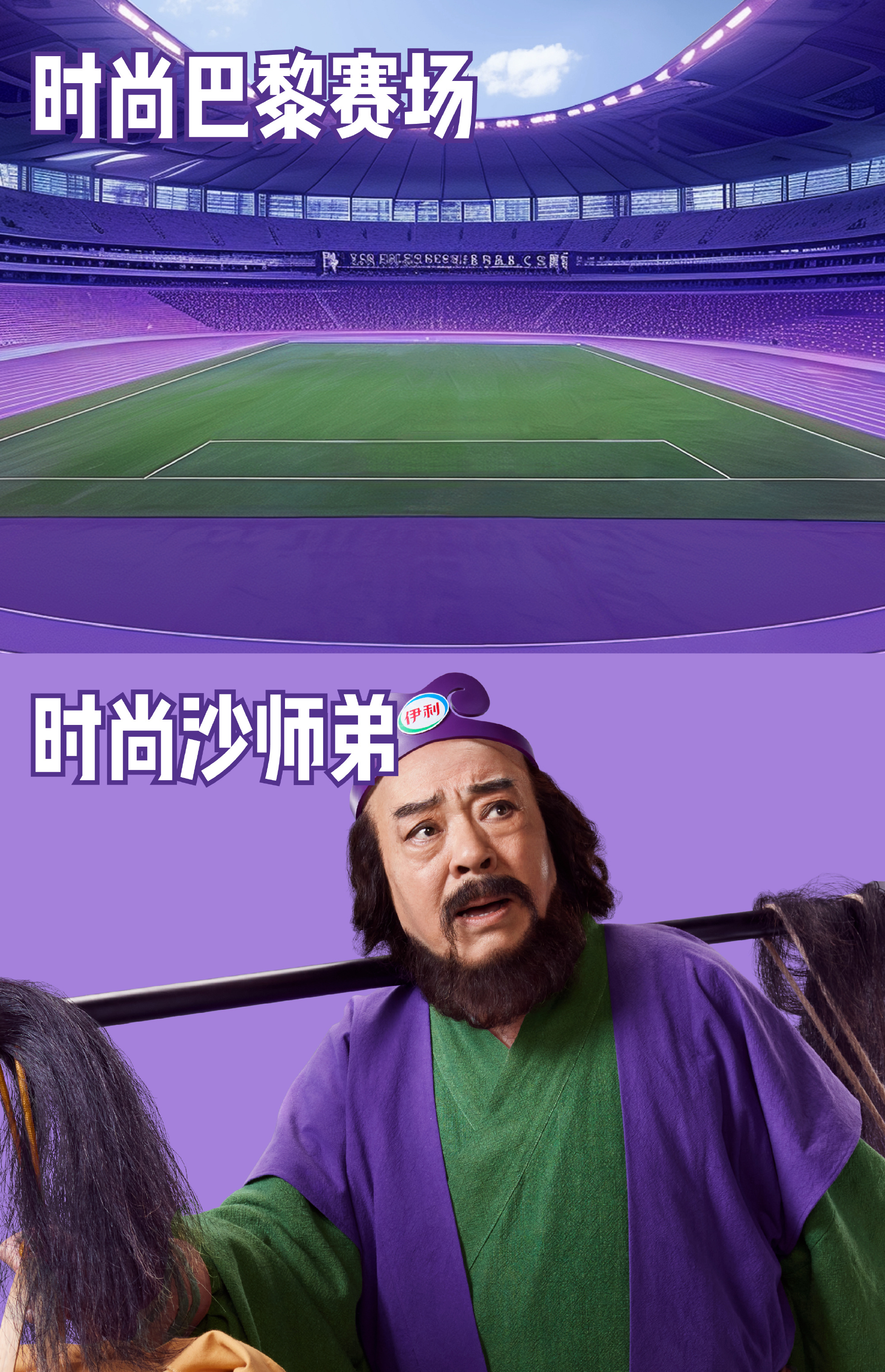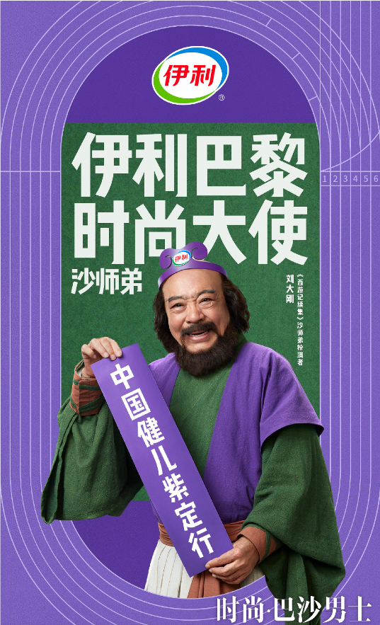 这么有中国特色的梗,伊利稳稳拿捏,请来沙和尚的扮演者刘大刚担任伊利巴黎时尚大使,别名——时尚·巴沙男士,好家伙,这下谁还分得清你沙和尚和时尚人士的区别。二者也带来超有梗的短片,在颇具动感的节奏中,沙师弟成为 8G 冲浪达人,网络梗不断,「想你的沙,还是吹向了巴黎」、「梦幻紫、巴黎紫,咋看咋像我身上的绝绝紫」,并且亲自认证了时尚巴沙的称号,用「紫」来预祝中国健儿「紫」定行。