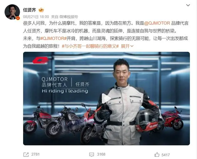8月21日,国内知名摩托车品牌QJMOTOR官宣艺人任贤齐(明星代言公司)为品牌代言人。同时任贤齐也通过自己的微博与QJMOTOR开启互动,截至发文,这条微博获得了2700多次的转发,3100多条评论和5400多个赞。