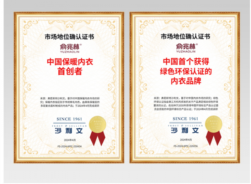 成立29年以来,俞兆林一直凭借产品创新占据着领先的市场地位。2024年,全球性的企业增长咨询公司弗若斯特沙利文基于对中国保暖内衣市场的研究,为俞兆林颁发了“中国保暖内衣首创者”“中国首个获得绿色环保认证的内衣品牌”两大市场地位确认证书。作为俞兆林最新打造的集恒温发热、凝热锁温于一体的全新产品系列,御风保暖衣不仅拥有发热、抗菌、润肤、环保等重磅功能,也将引领着行业保暖产品在科技、面料、工艺等多维度的升级。