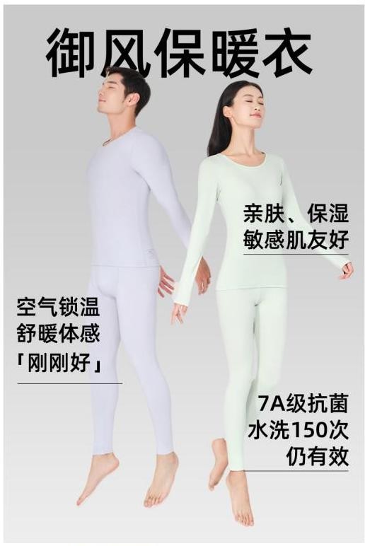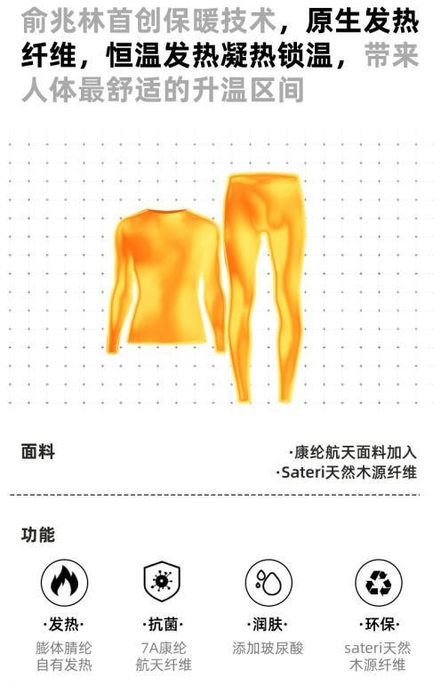 在面料方面,该系列新品材质由48%再生纤维系纤维、44.8%腈纶、7.2氨纶组成。膨体腈纶是拥有三层结构,具备蓄热锁温科技,能自有发热。康纶航天纤维属于7A级别,能够实现物理抗菌,具备远红外发热以及防臭功能。产品还采用Sateri天然木源纤维,环保亲肤不刺激。玻尿酸的添加,也让御风保暖衣可以具有润肤保湿功效。同时,产品以双面抓剪烫工艺制作完成,能帮助体感温度升温4.5°C。不止产品,俞兆林还重新定义高端系列御风保暖衣的价格,每套售卖价仅为129元,通过对行业的引导力、用户的洞察力,彰显国民品牌作为行业领先者的价值与能量。