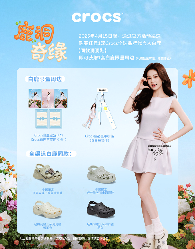 此次,白鹿同款的两款洞洞鞋——摇滚玫瑰小鲸鱼洞洞鞋、经典泡芙花束洞洞鞋,皆为中国区限定鞋款。4 月 15 日-21 日,消费者于 Crocs 天猫超级品牌日期间,在天猫官方旗舰店购买白鹿同款洞洞鞋即可解锁代言人专属限量周边。此外,4 月 20 日,代言人白鹿还会空降 Crocs 天猫官方旗舰店直播间为洞门人派发多重惊喜福利。