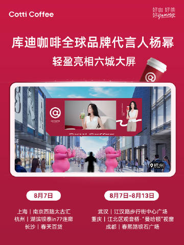 8 月 7 日起,代言人咖茶生活大片也将轻盈亮相上海、杭州、长沙、武汉、成都、重庆六城商圈大屏,供粉丝六城寻「幂」。打卡代言人大屏有机会获得咖啡饮品券。