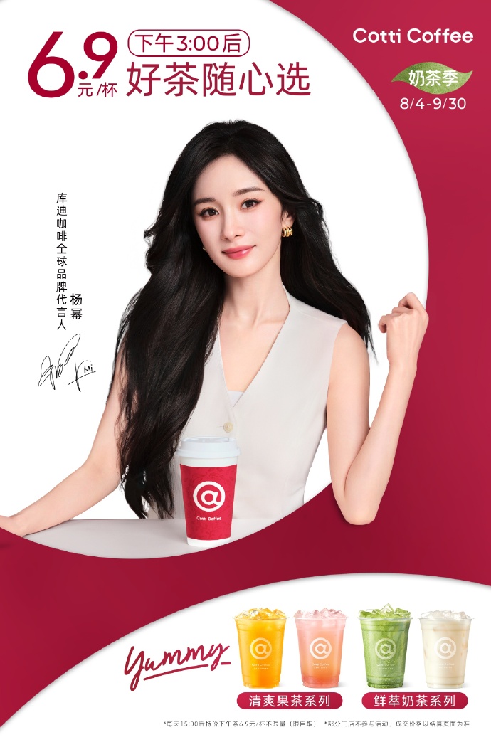 8 月 4 日,库迪咖啡正式官宣全球品牌代言人杨幂(明星代言公司),并发布代言人短片。短片中,沿用代言人杨幂擅玩谐音梗的特质,邀请大家和杨幂一起解锁好咖好茶好「yummy」,同时品牌同步上新羽衣系列饮品。