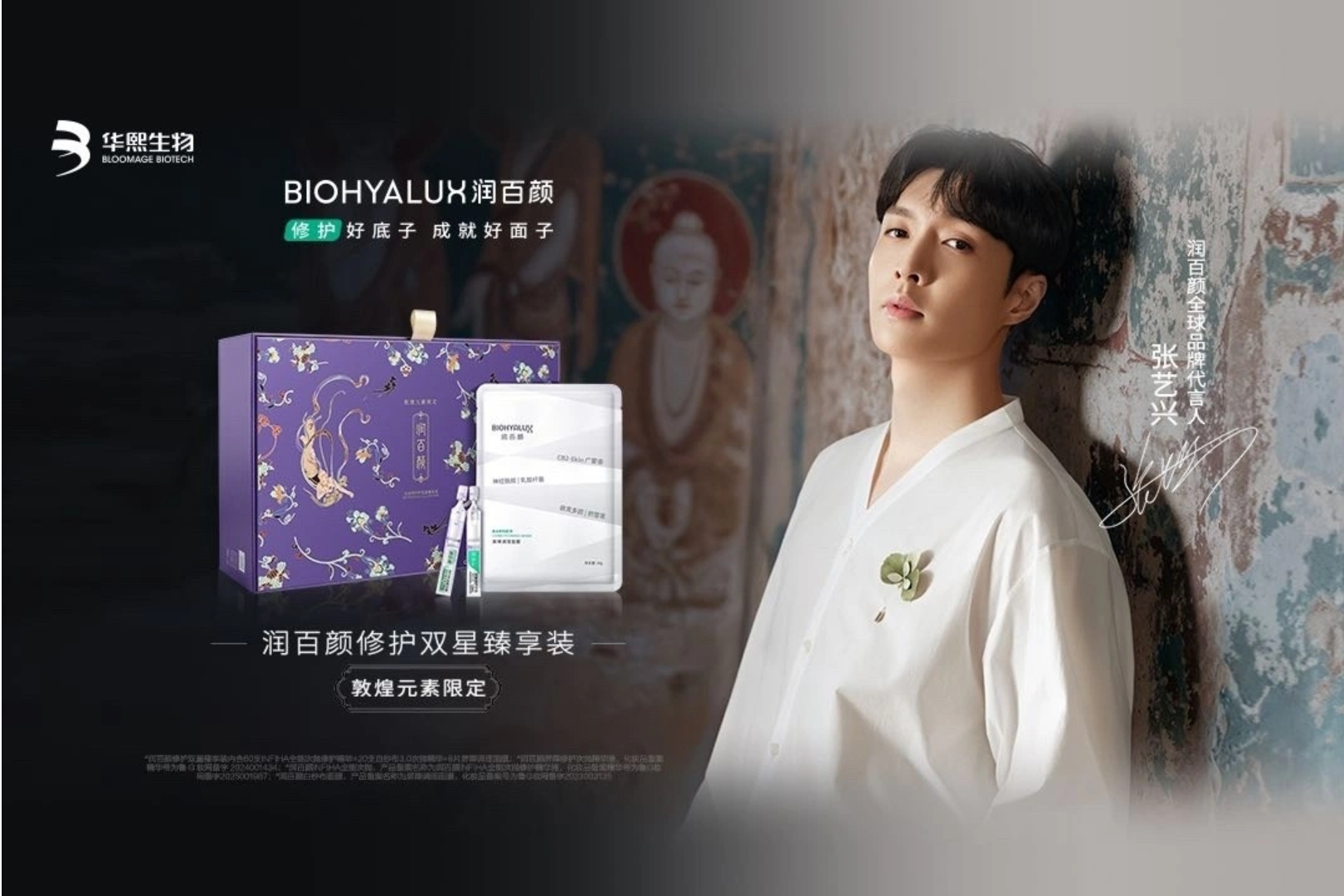8 月 20 日,润百颜官宣张艺兴(明星代言公司)为首位全球品牌代言人。在舞台上,张艺兴以全能热爱守护舞台梦想;润百颜同样以修护之力守护肌底好状态。此次双方携手,将围绕敦煌文化共同开启一场穿越千年的对话,揭晓「时光不蚀」的修护智慧。据悉,代言人同款「润百颜双星」礼盒现已上架各大平台销售,除了精美的敦煌元素外,礼盒内含的 IHFIHA 全能次抛精华及白纱布次抛精华,也将双效内修外焕,一起「艺」修到底、内外兼护,成就每一寸肌肤之美。