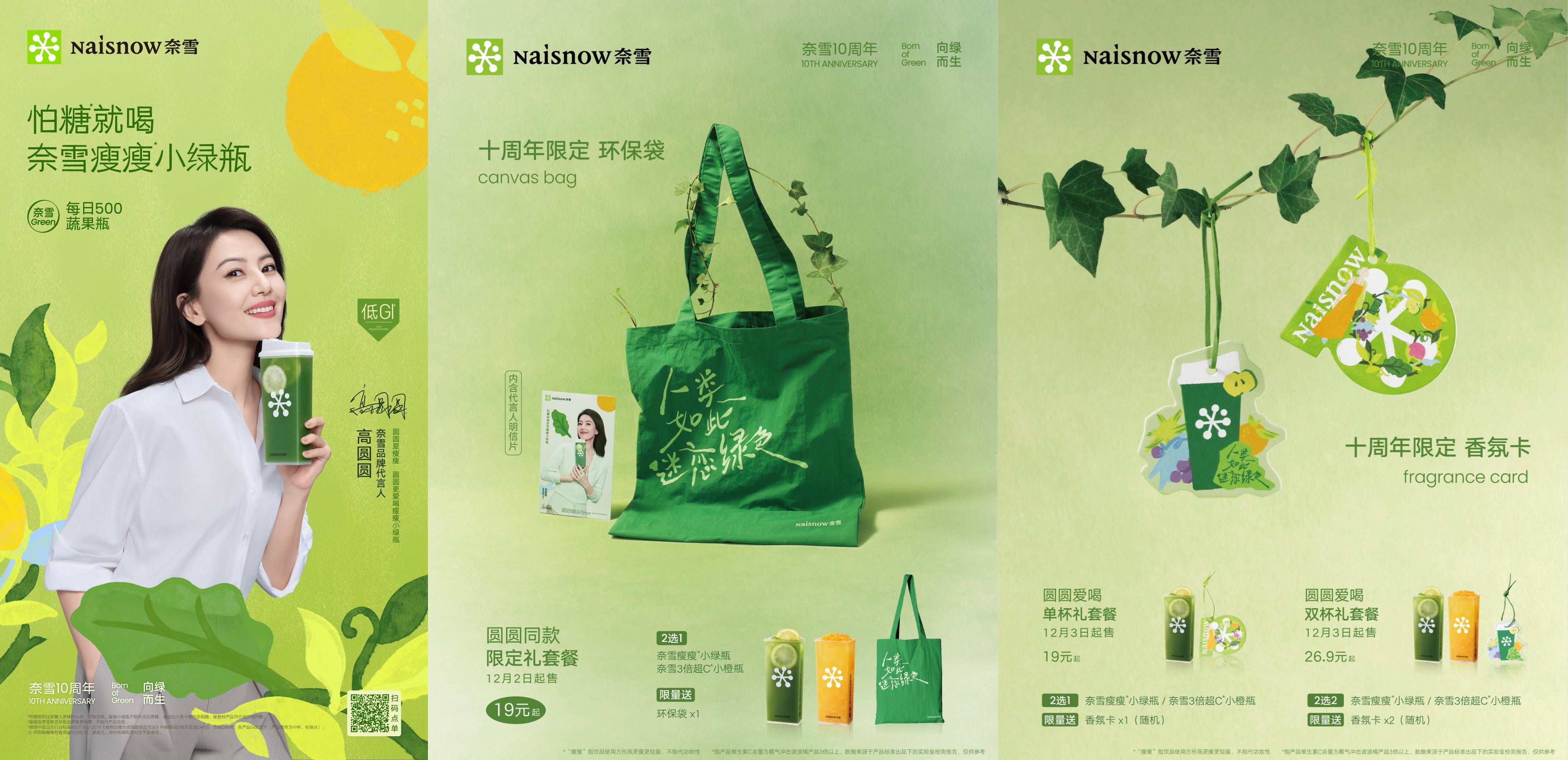 奈雪十周年,向绿而生。12 月 3 日,奈雪的茶正式迎来品牌十周年节点,特别官宣演员高圆圆(明星代言公司)成为其品牌代言人,并同步推广其主打产品「瘦瘦小绿瓶」。此次营销巧妙玩转了代言人名字「圆圆」与产品「瘦瘦」之间的反差感,迅速引发消费者关注和讨论。