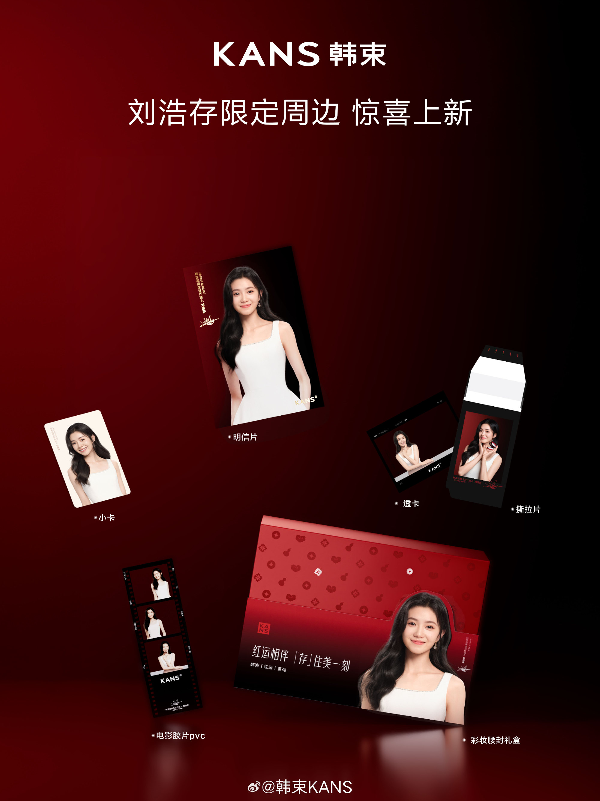 为强化代言声势,韩束在线下多个城市核心商圈、梯媒推出代言人大屏广告,12 月 18 日起消费者可打卡邂逅刘浩存的星光时刻。同时,品牌还推出了刘浩存定制明星片、拍立得小卡等限定周边,并开启微博互动抽奖,吸引粉丝参与传播,进一步助推「红运底妆」系列产品的曝光与转化。