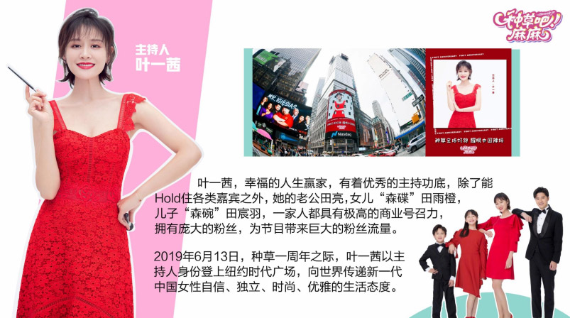 《种草吧麻麻》中国内地知名女歌手、主持人、演员叶一茜强势加盟,节目每期邀请一位明星妈妈带团助阵,全能辣妈叶一茜与明星妈妈带团种草,一起探索家庭智慧,分享时尚妈妈们的生活方式。
