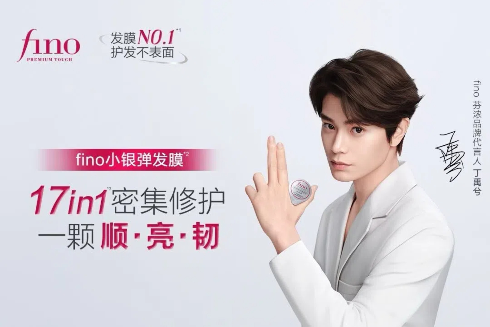 专注护发产品的 fino 芬浓官宣丁禹兮(明星经纪公司)为品牌代言人,并同步推广旗下新品「fino 小银弹发膜」。