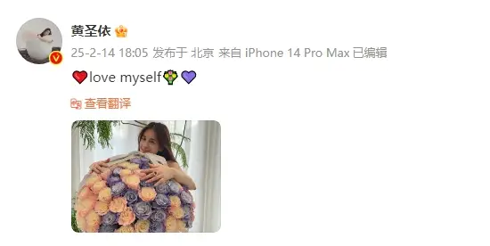 14日,黄圣依(明星经纪公司)在情人节当天晒出一张美照,并配文称:“爱自己。”照片中,黄圣依戴着心形钻戒,拥抱着一大束鲜花,笑容满面,心情大好!