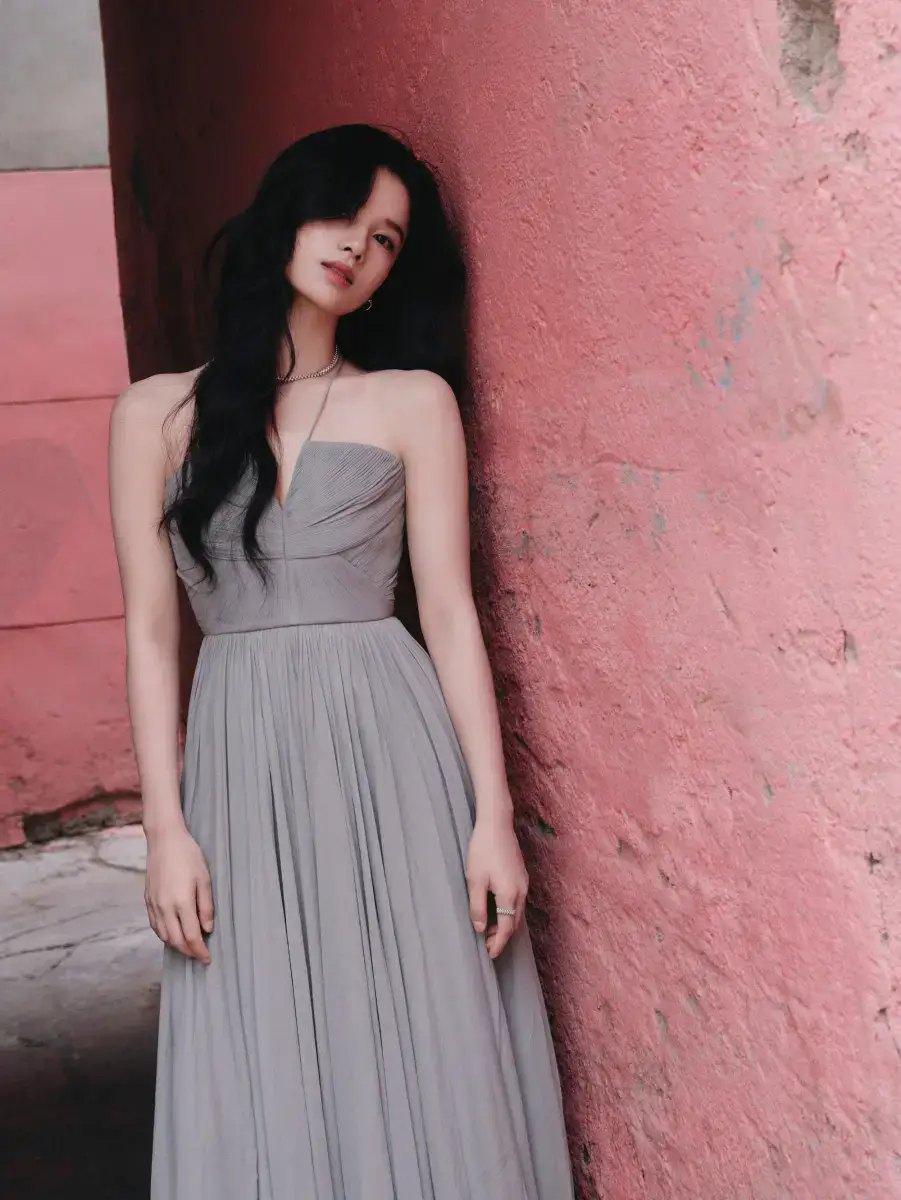 7月28日,张婧仪(明星经纪公司)工作室晒出了一组她的最新活动造型图。张婧仪身穿灰色抹胸纱裙,靠在墙边。