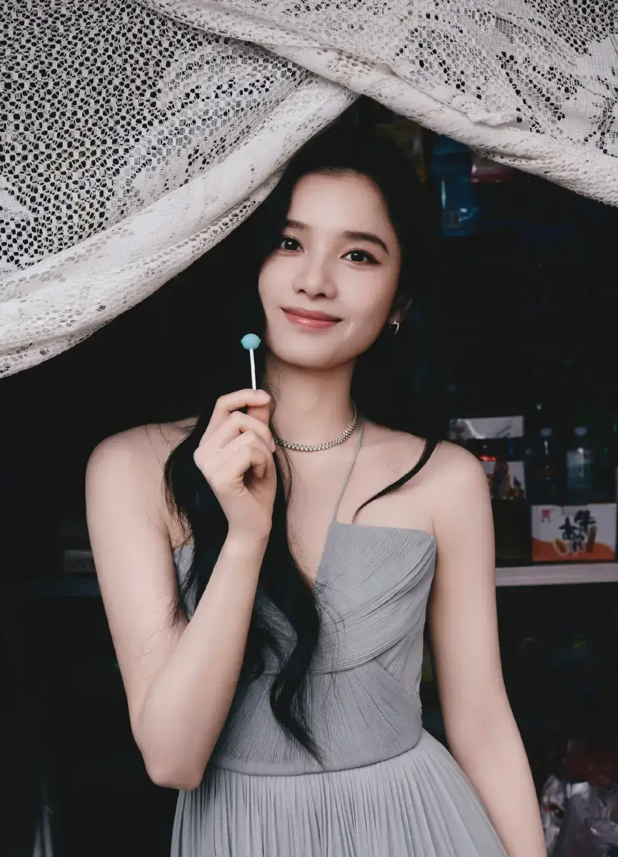 张婧仪灰色纱裙造型飘渺灵巧 漫步小巷似快乐精灵