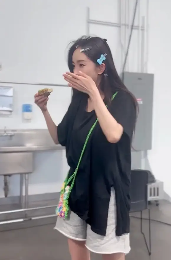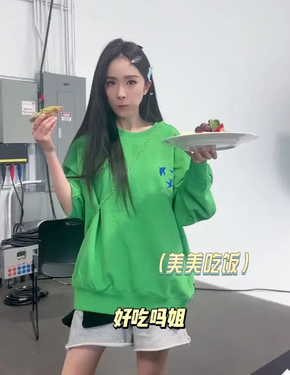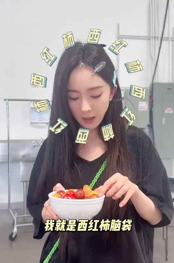 杨幂工作前大口吃番茄 穿格子衫单脚立活泼可爱