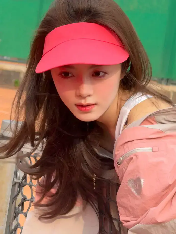 赵今麦身穿运动背心搭配粉色遮阳帽。