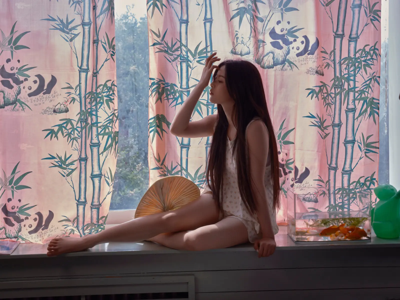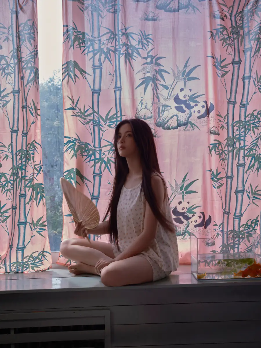 杨超越坐在窗边摇蒲扇,秀发飞扬,美貌在线。