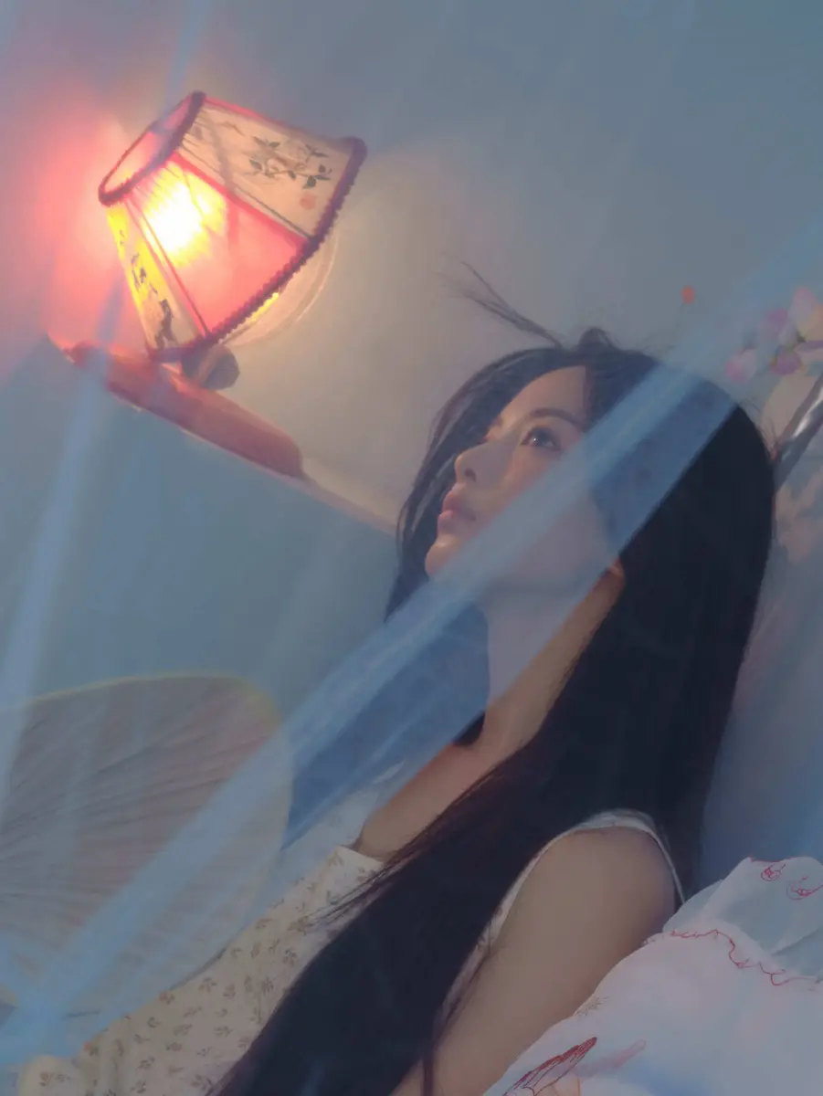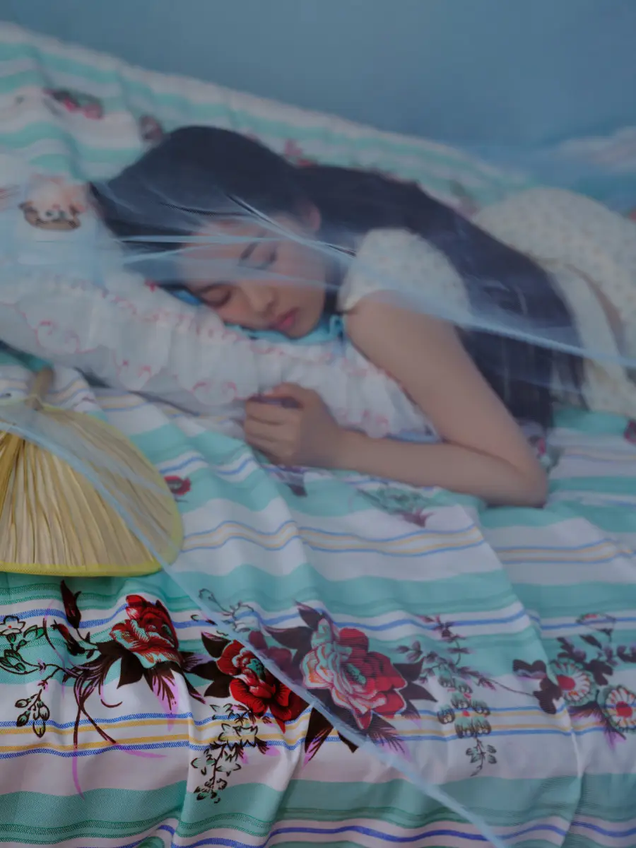 杨超越坐在蚊帐里休息。