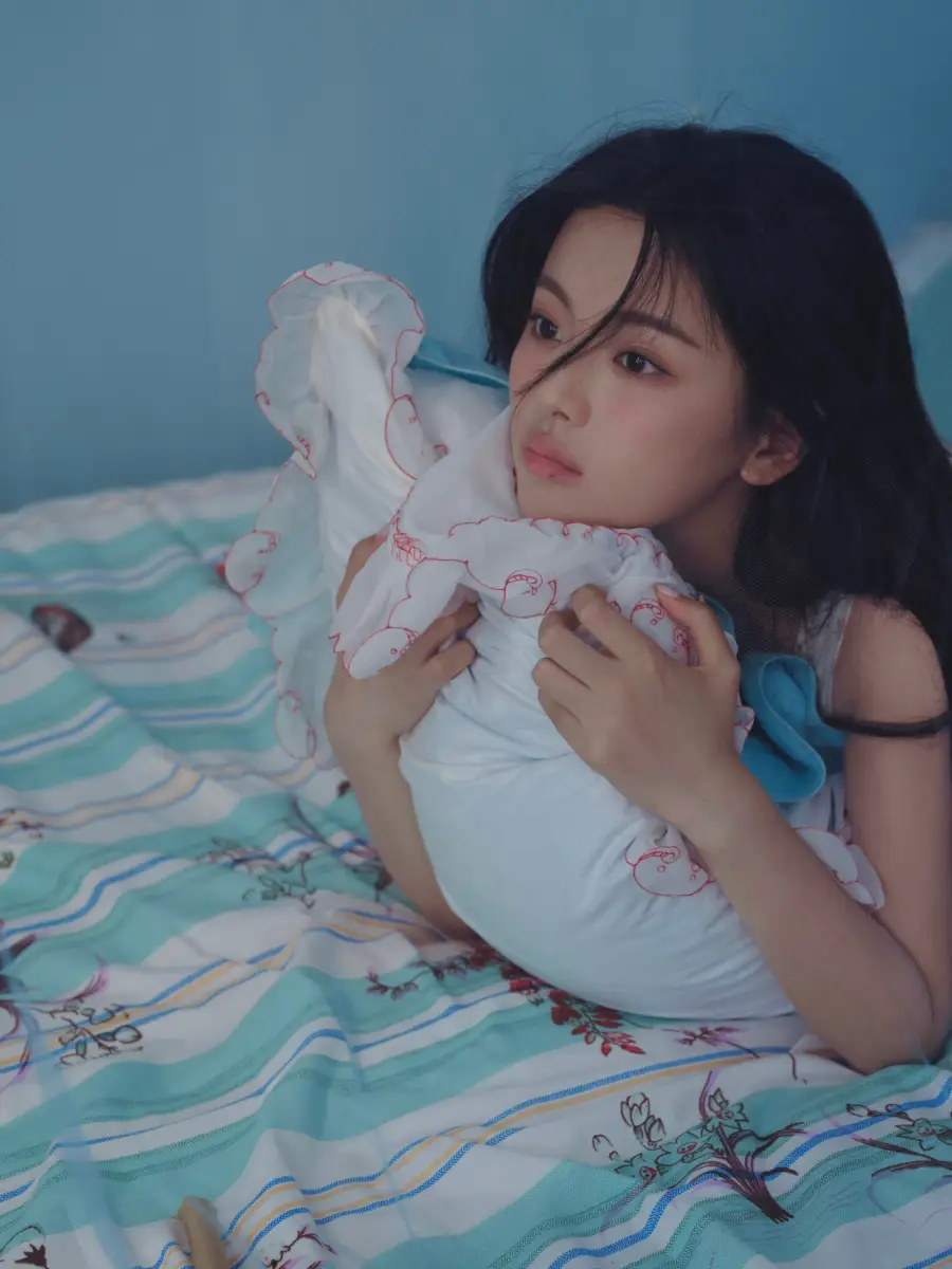杨超越抱着枕头的样子就像小女孩一样,超可爱。