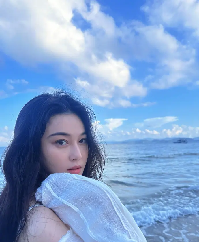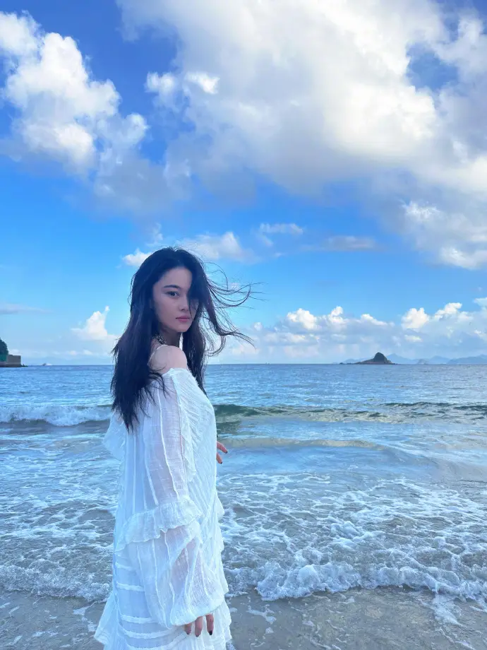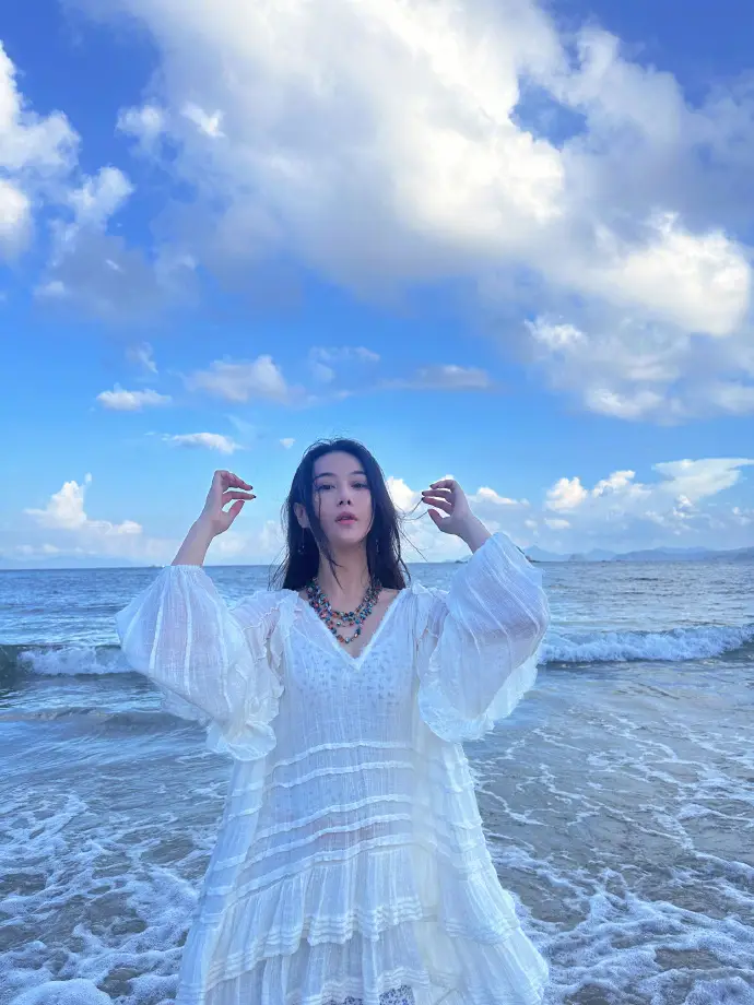 张馨予海边回眸美艳大方 一身白衣清纯动人
