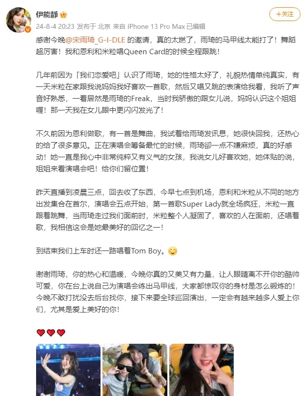 4日,伊能静(明星经纪公司)在社交平台上发长文感谢宋雨琦,并晒出与儿子恩利和女儿米粒一起看宋雨琦演唱会的合照。