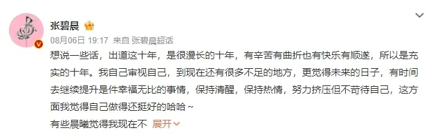 想说一些话,出道这十年,是很漫长的十年,有辛苦有曲折也有快乐有顺遂,所以是充实的十年。我自己审视自己,到现在还有很多不足的地方,更觉得未来的日子,有时间去继续提升是件幸福无比的事情,保持清醒,保持热情,努力挤压但不苛待自己,这方面我觉得自己做得还挺好的哈哈~