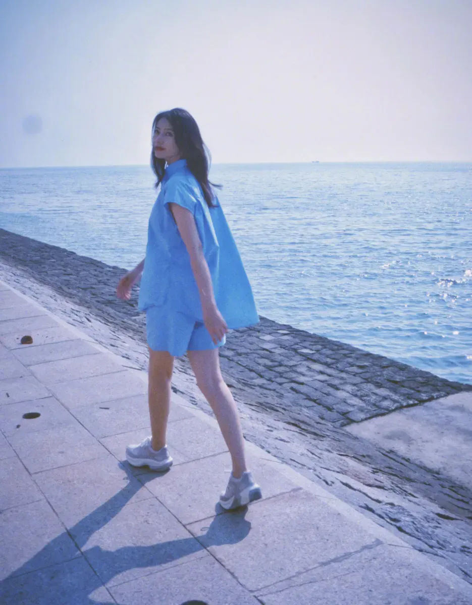 高圆圆穿蓝色连衣裙和海边适配度拉满。