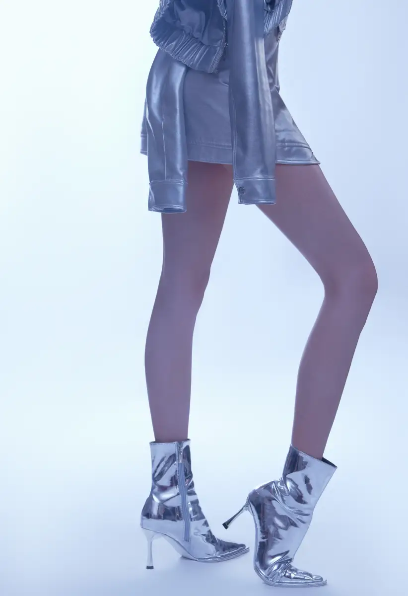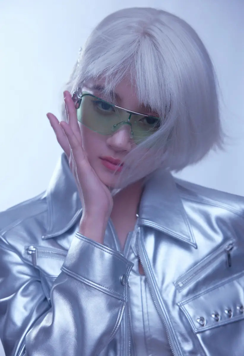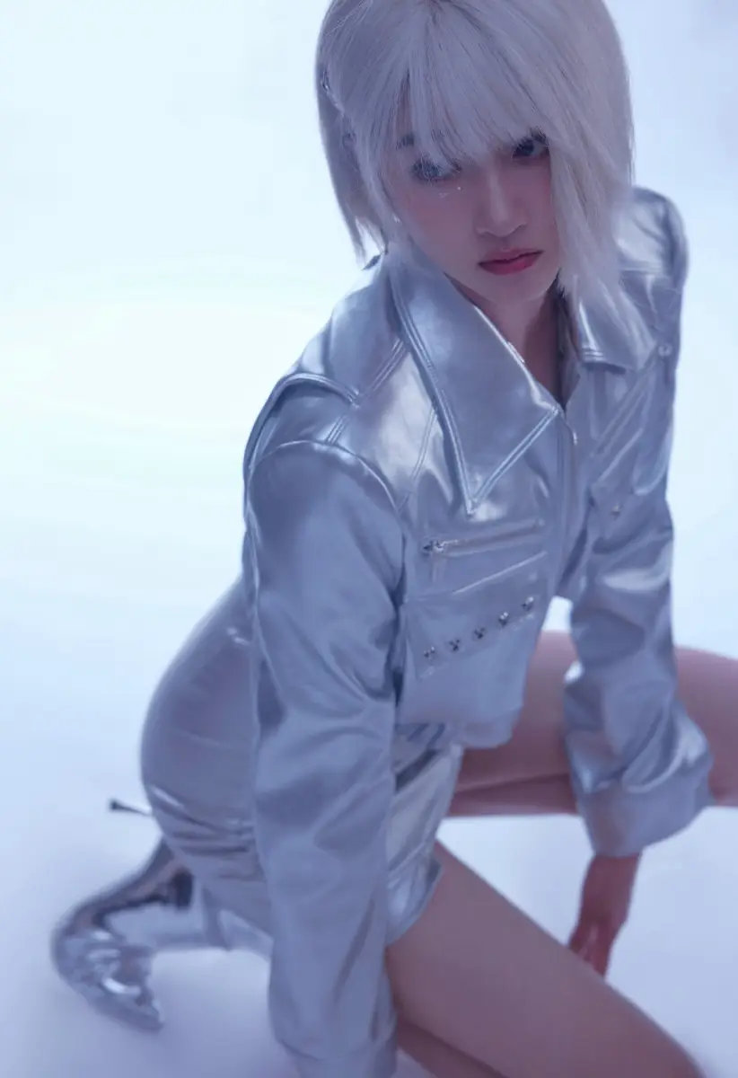 她一身液态金属套装光泽缓缓流动,诠释潮酷姿态。