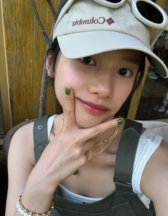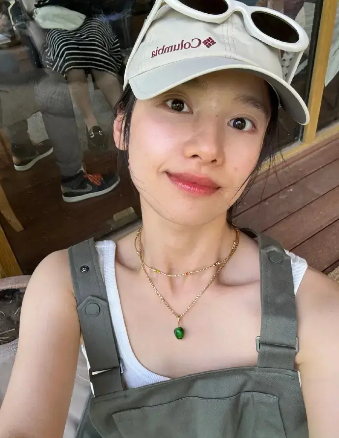 张婧仪带棒球帽。