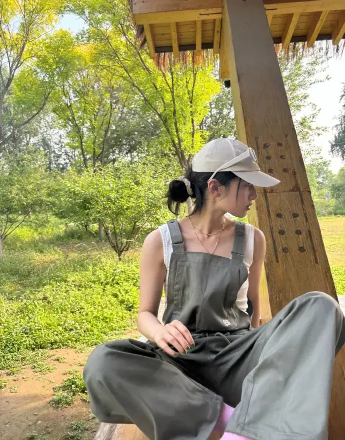 张婧仪晒公园松弛感照片 穿背带裤少年感满满