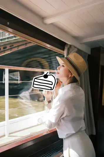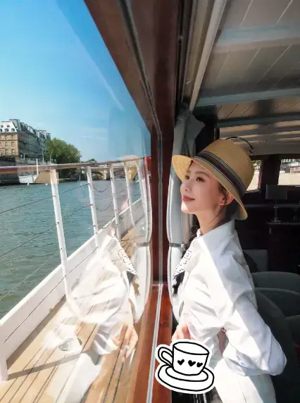 刘诗诗乘坐游船,欣赏窗外美景很开心。