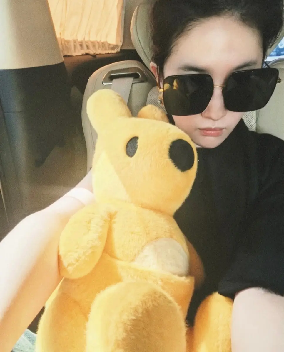 刘亦菲戴着墨镜,抱着玩偶自拍。