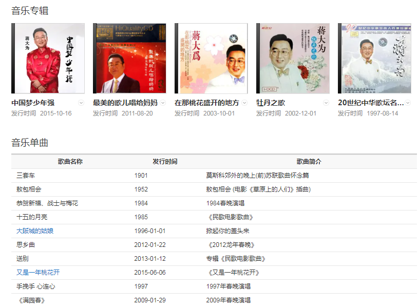 蒋大为是中国男高音歌唱家,也是一位具有实力的歌唱家,八十年代他演唱电影《红牡丹》的主题曲《牡丹之歌》一曲成名,以后一首首脍炙人口的好歌如《在那桃花盛开的地方》《敢问路在何方》等。