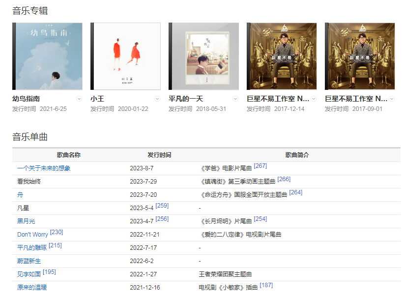 代表作品:像我这样的人、平凡的一天、如果有一天我变得很有钱、消愁、感觉自己是巨星、借、不染、无问、小王、盛夏、二零三、深夜一角、给你给我、一荤一素、海上日记 、城市傍晚 、于是没有洗头