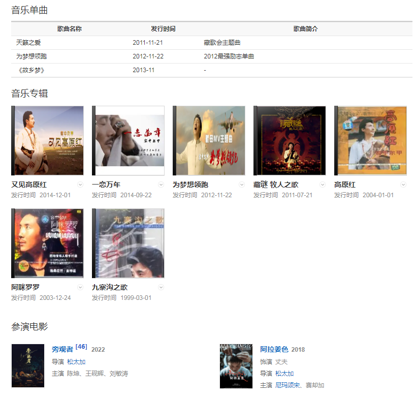 代表作品:高原红、神奇的九寨、牧人之歌、天籁之爱、为梦想领跑