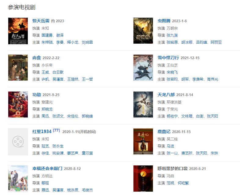 代表作品:狼毒花、侦探成旭、锄奸、三国、护国将军传奇、娘要嫁人、劝和小组、木府风云、红高粱、天龙八部