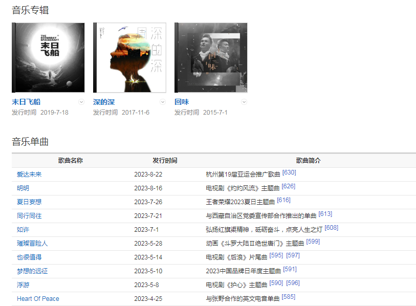 代表作品:大鱼、灯火里的中国、望、和光同尘、Rubia、可它爱着这个世界、梅香如故、亲爱的旅人啊、和光同春、触不可及、悬崖之上、化身孤岛的鲸、有我