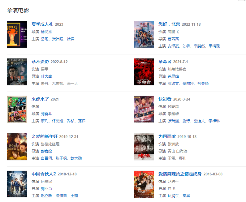 2008年参演电影《一半海水一半火焰》,同年参与拍摄30集电视剧《杏花魂》 。
