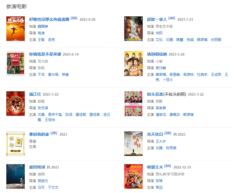 2023年1月22日,特别出演的电影《满江红》上映 ;同日,参演的合家欢喜剧《抬头见喜》上映。 2023年1月23日(大年初二),特别出演的电影《东北恋哥2》上映 。