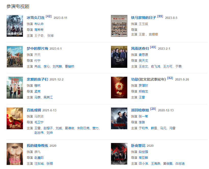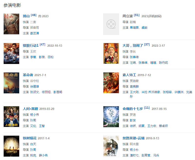 代表作品:会痛的十七岁、老炮儿、小男人遇上大女人、丑女无敌、谍·莲花、枪械师、恋爱SOS、那小子真帅、齐天大圣前传