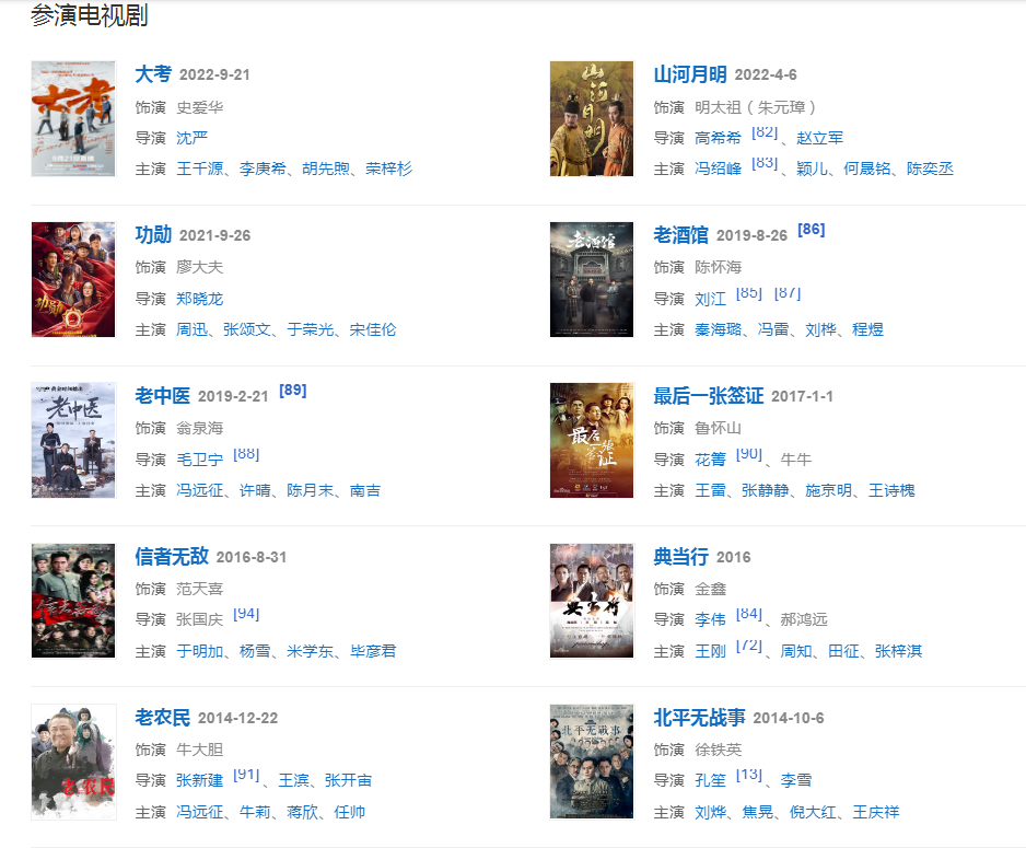 代表作品:大宅门、汉武大帝、大明王朝1566、茶馆、北平无战事、老农民、湄公河大案、老酒馆