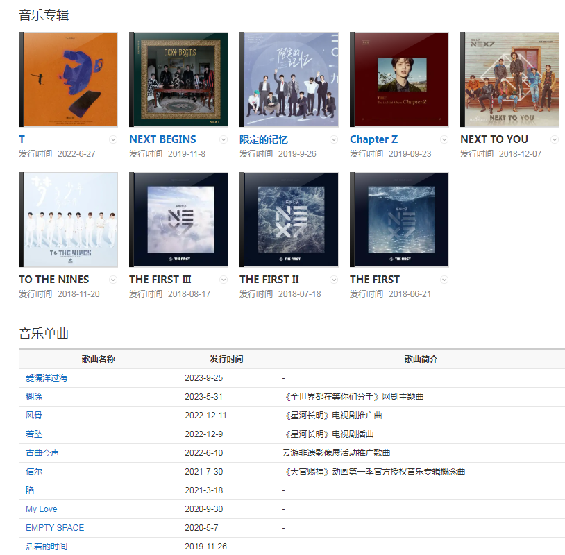 2019年9月23日,推出首张个人MINI专辑《Chapter Z》;10月17日,入选2019福布斯中国30岁以下精英榜。