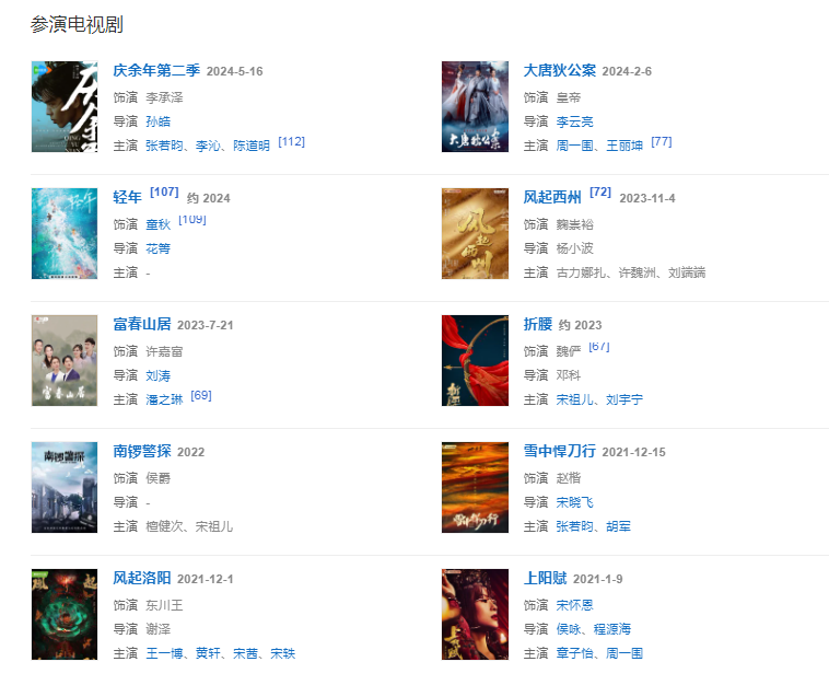 代表作品:八子、嘿,老头!、少帅、绣春刀2:修罗战场、我们都要好好的、庆余年、诛仙等。