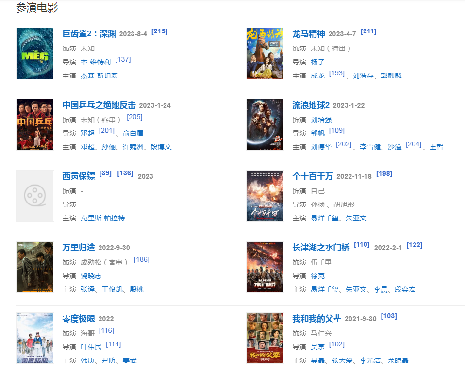 代表作品:战狼、战狼Ⅱ、流浪地球、杀破狼2、攀登者、长津湖、太极宗师、我是特种兵之利刃出鞘