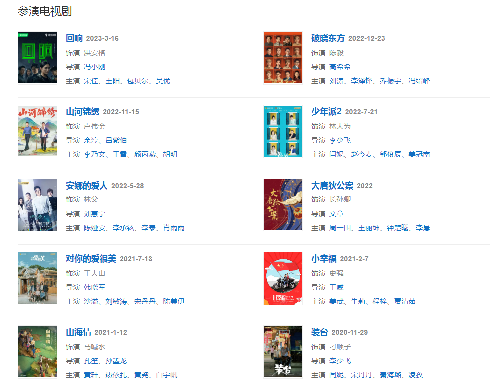 2020年6月,主演抗疫题材电视剧《在一起》;同年,主演的电视剧《装台》上映。